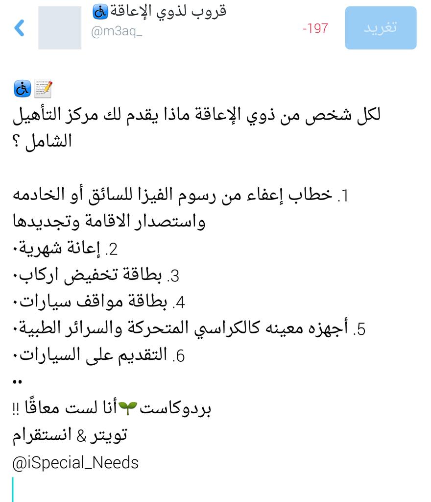 خطاب من التاهيل الشامل. يشترط ألا يكون عمر المستفيد من التأهيل متجاوز ا وقت حدوث الإعاقة عمر الـ 45 عام ا. شروط التاهيل الشامل. شبكة ذوي الاعاقة السعودية التاهيل الشامل. 2 ثم عقب ذلك قم باتباع الخطوات اللازمة لاستخراج تاشيرة من التاهيل الشامل.