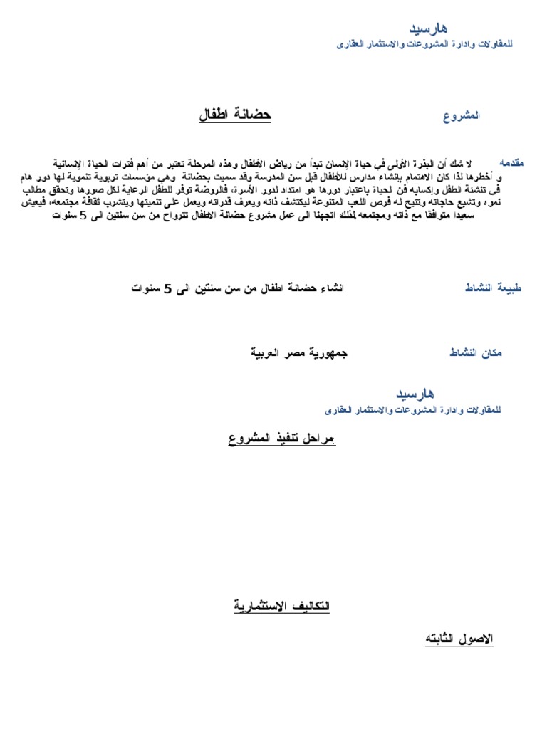 دراسة جدوى لمشروع حضانة اطفال فى مصر Pdf