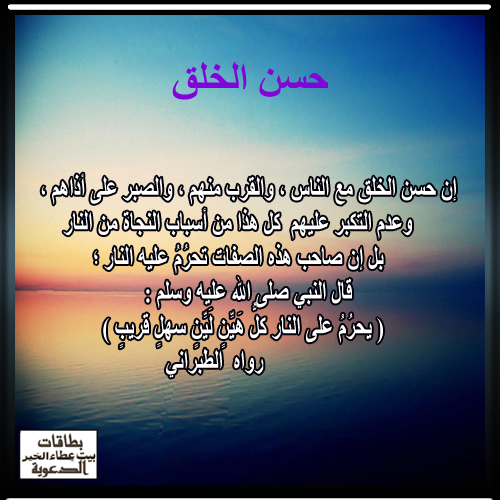 رواه الهيتمي المكي في الزواجر عن عبد الله بن عمرو الصفحة أو الرقم. كلمات عن ح سن الخ لق. صاحب الخلق الحسن يحب ب إليه الناس جميعا بل وحتى أعدائه لأنه بأخلاقه الحميدة يتمكن من إرضاء الناس على اختلاف طبقاتهم والخلق الحسن يسهل على الداعية إدراك مطالبه فالدعاة لا يسعون الناس بأموالهم ولكن بحسن الخلق وبسط الوجه وكان الرسول صلى الله عليه وسلم يدعو ربه أن. سئل رسول الله صلى الله عليه وسلم عن أكثر ما يدخل الناس الجنة فقال.